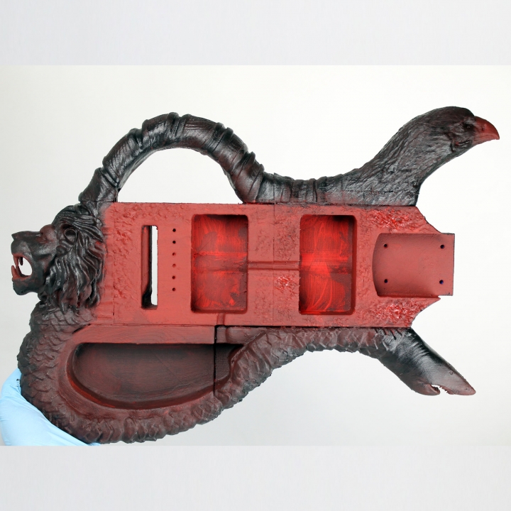 Дизайн инструмента базировался на рисунках к Некрономикону Лавкрафта, а на ее печать ушло порядка 80 часов. Кстати говоря, печатью корпуса занимался принтер Delta Wasp 3D.