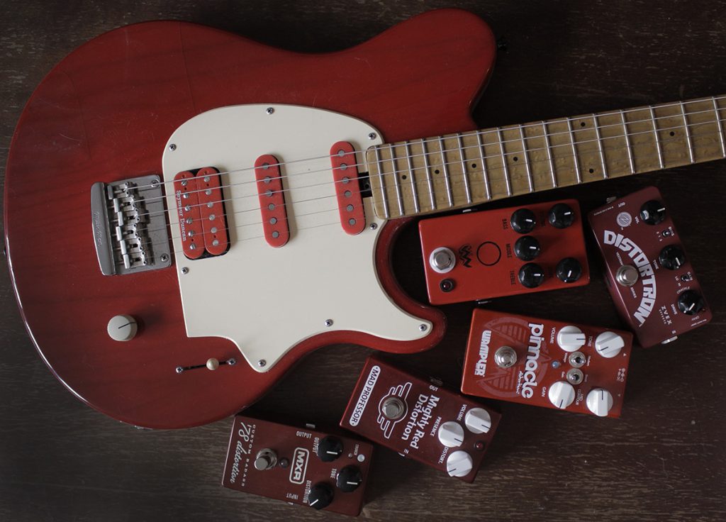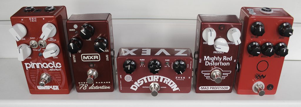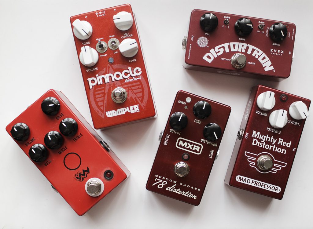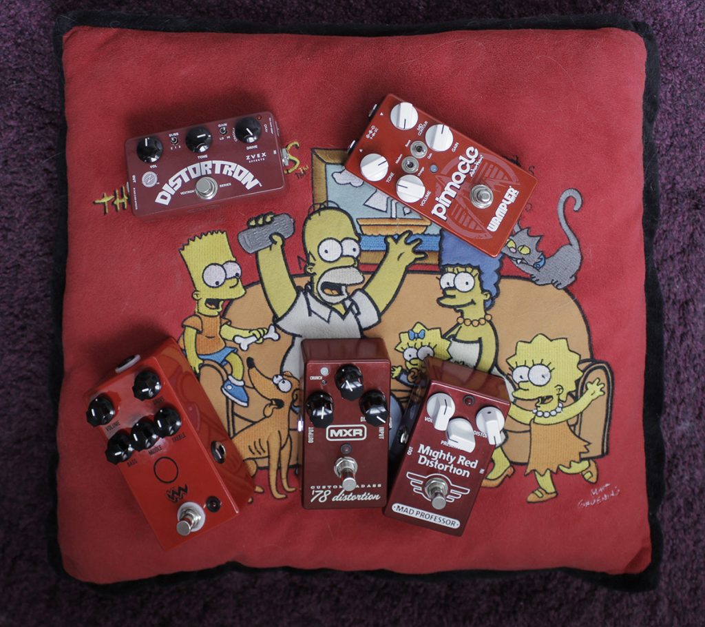 Так случилось, что красный цвет достаточно популярен в примочках перегруза. Часто его используют для педалей, выдающих звучание близкое к усилителям Marshall серий JCM. Разумеется, все эти приборы часто сравнивают между собой, чтобы выбрать какой-то наиболее приятный на слух. Не претендуя на истину, я выпросил на несколько дней в Pedalzoo четыре красных дисторшна и добавил к ним один свой, купленный, кстати, тоже в Pedalzoo. Получилось пять педалей: