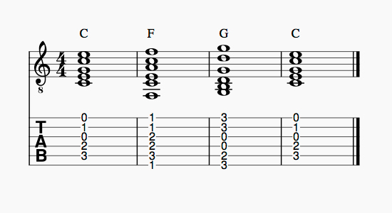 - I-V-IV-V (C-G-F-G) встречается в блюзе, фолке и кантри-роке;