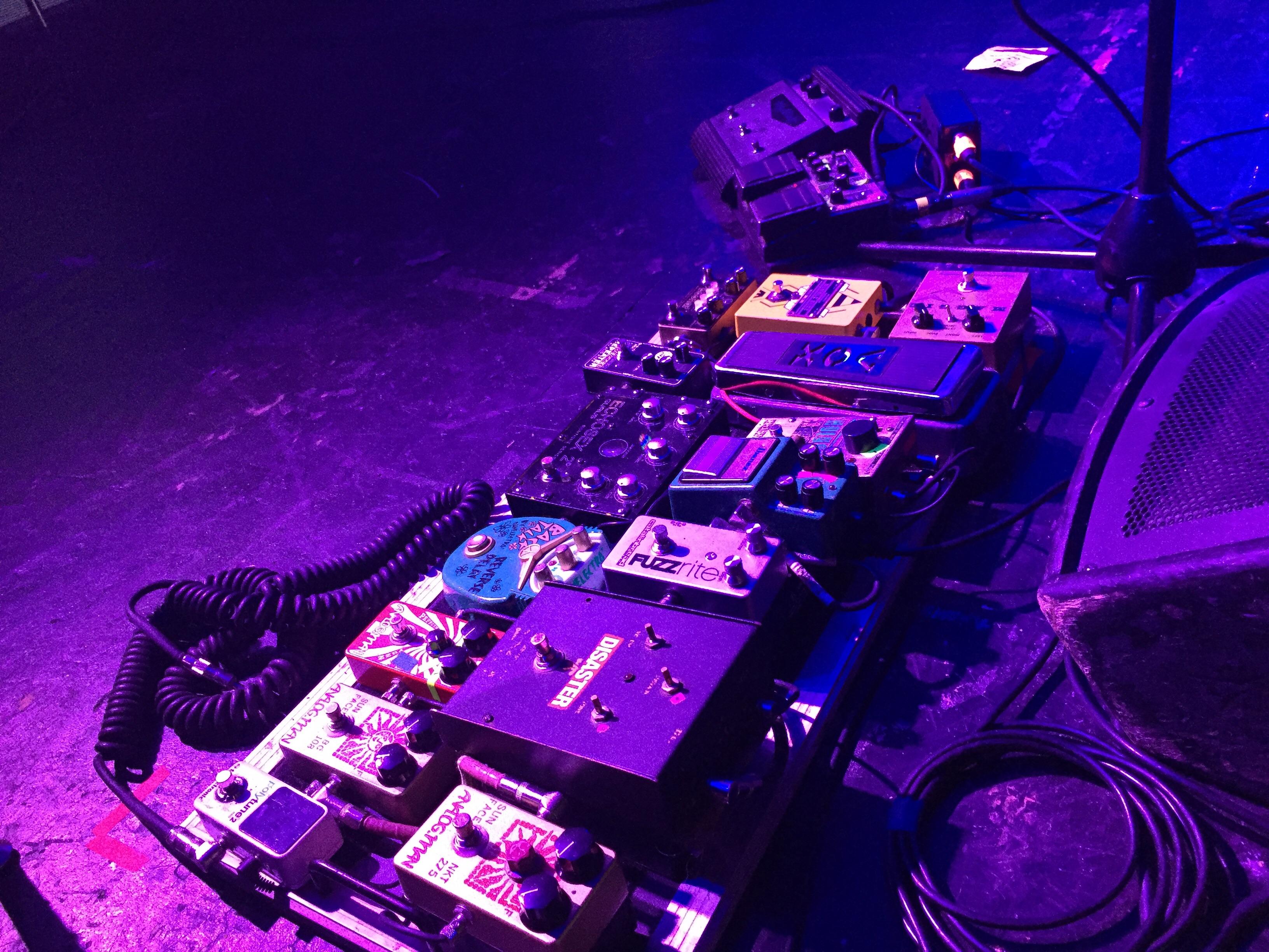 Между дилеями Echosex2 и Boonar - недорогое тремоло от американской бутиковой конторы Acid Fuzz, воспроизводящее классическое Vox Repeat Percussion. Интересно, что у второго гитариста группы, Кайла Ханта, в борде тремоло такого же типа - Earthquaker Devices Hummingbird.