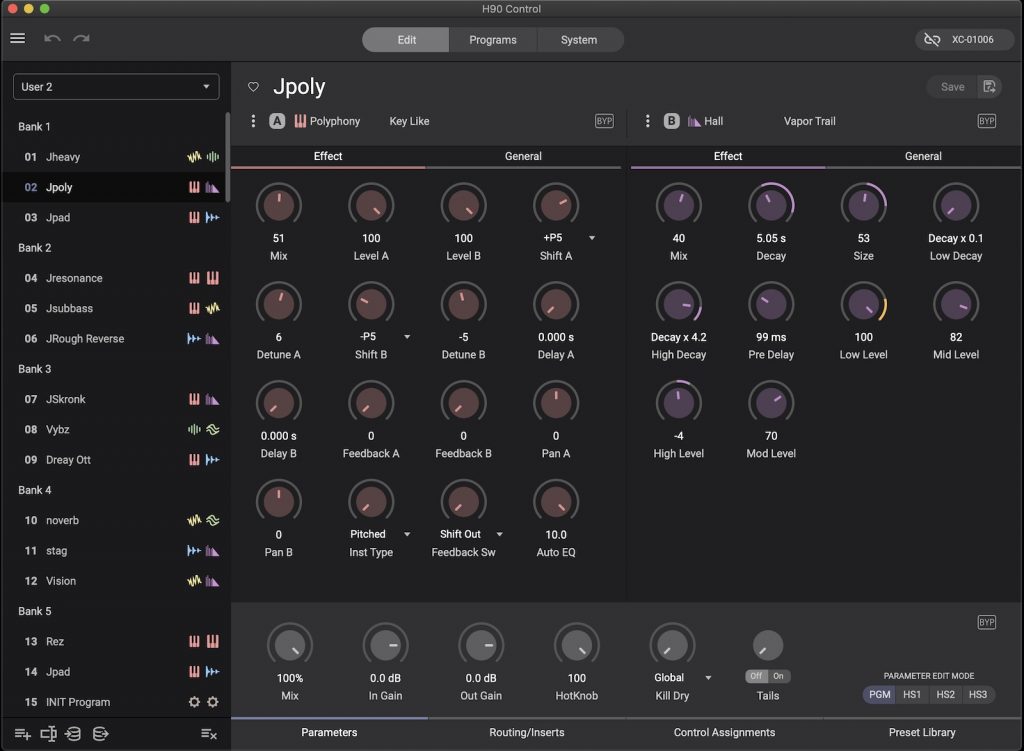 Также H90 полностью открыт для внешних источников управления. Два порта экспрессии могут быть настроены для использования либо с традиционными педалями экспрессии, либо с тройными ножными aux-контроллерами. Педали экспрессии обеспечивают непрерывный контроль над назначенными параметрами, в то время как переключатели aux имеют больше свободы в назначении элементов для управления, чем встроенные ножные переключатели. Также имеется MIDI-управление через 5-тиконтактный разъем DIN или USB-C с обширной конфигурацией, доступной для программ, пресетов и глобальных настроек. В меню Сопоставления Параметров есть очень полезная функция обучения, которая мгновенно сопоставляет параметр со следующим источником управления, от которого H90 получает данные, будь то педаль экспрессии, вспомогательный переключатель или сообщения контроллера MIDI (CC).