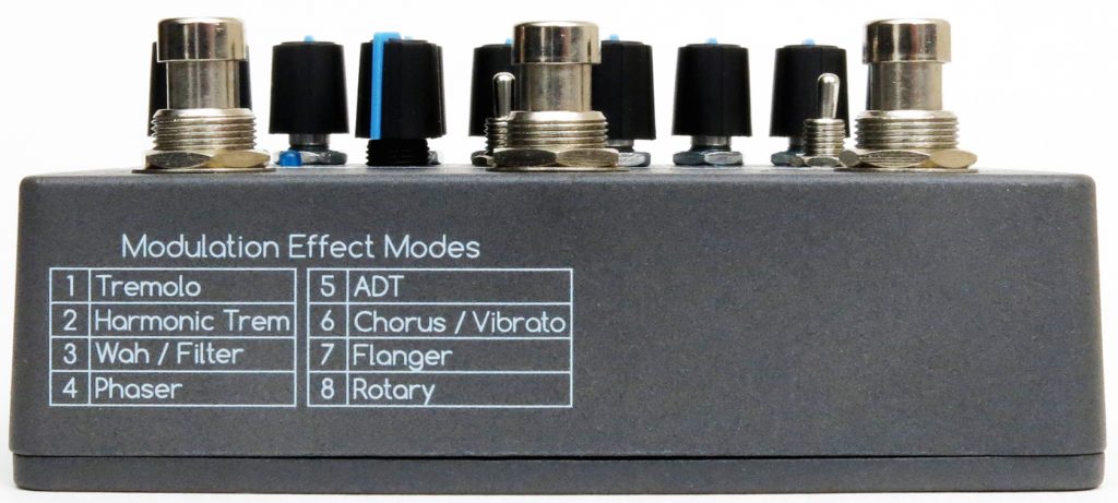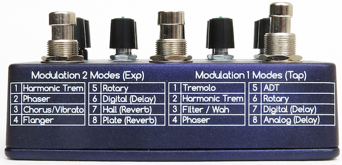 Во-вторых, широкие возможности коммутации, что также увеличивает показатели универсальности педали. Помимо стандартных IN и OUT у вас есть еще пара гнезд. Одно для подключения педали-контроллера для набивания темпа эффектов модуляции (tap), и второе - петля дополнительных эффектов для кабеля типа Y (с одной стороны стерео джек, с другой два моно).