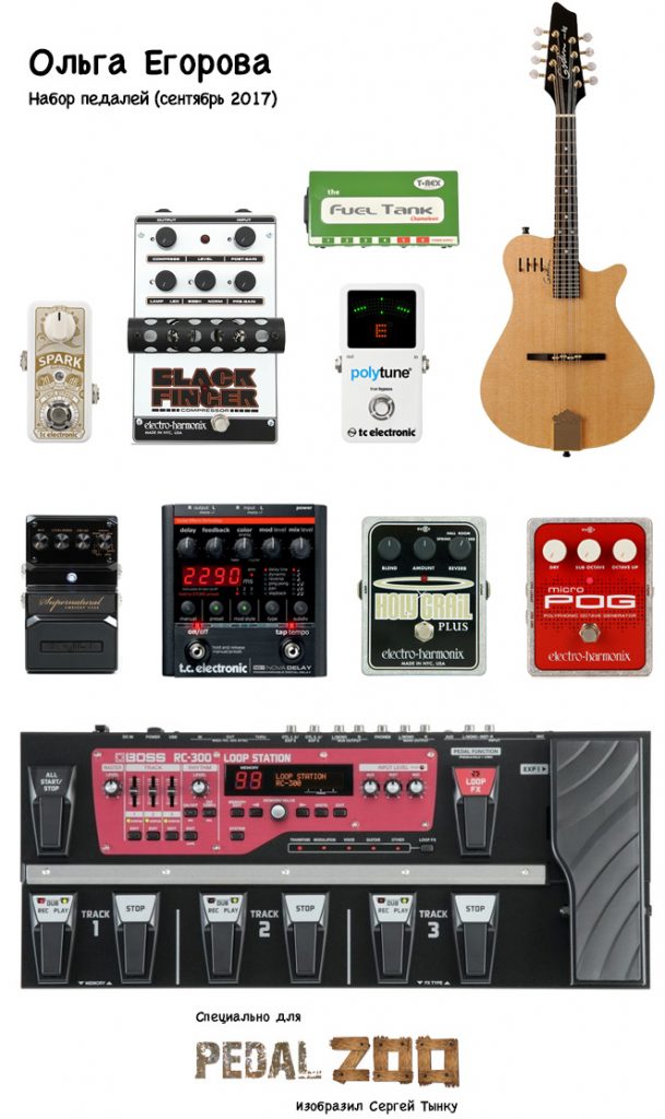 Инструменты Ольги оборудованы звукоснимателями и она активно пользуется педалями, которые изначально выпускают для гитаристов. Я попросил ее сказать пару слов на тему двух чехлов оборудования, которые приходится брать на концерты, и она любезно согласилась прокомментировать состав своего борда.