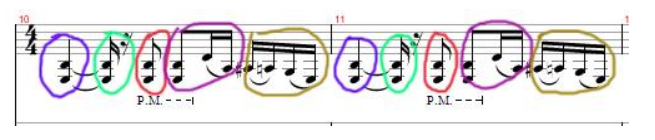 Каждая нота и каждая группа нот при точном повторении становятся элементами пульсации. Повторяемые элементы очевидны, но для наглядности я обвел их одинаковыми цветами.