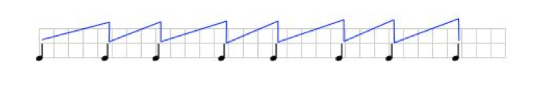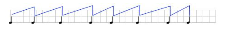 Третий рисунок содержит те же элементы, что и второй, но нарушенное расположение портит все впечатление. Можно говорить о наличии грува, когда в игре прослеживается, ощущается такая же закономерность, как в правильном орнаменте. Если визуализировать при помощи линий промежутки времени между нотами, то при хорошем груве эти линии также образуют своеобразный орнамент. Например, такой грув у метронома, он простой прямой: