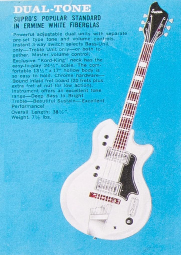 Если смотреть на нее (а мне досталась модель Supro Dual-Tone) издалека, то может показаться, что это еще одна вариация на тему лесполов. Два как-будто хамба, фиксированный бридж, близкий к однорогому корпус, голова с колками 3+3 и прямоугольные маркеры на грифе. Однако, это оказался совсем не леспол (хотя мензура леспольная). Но сначала немного истории.