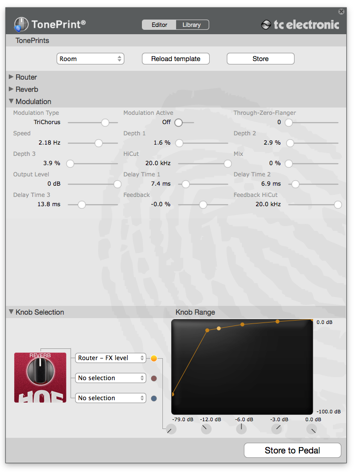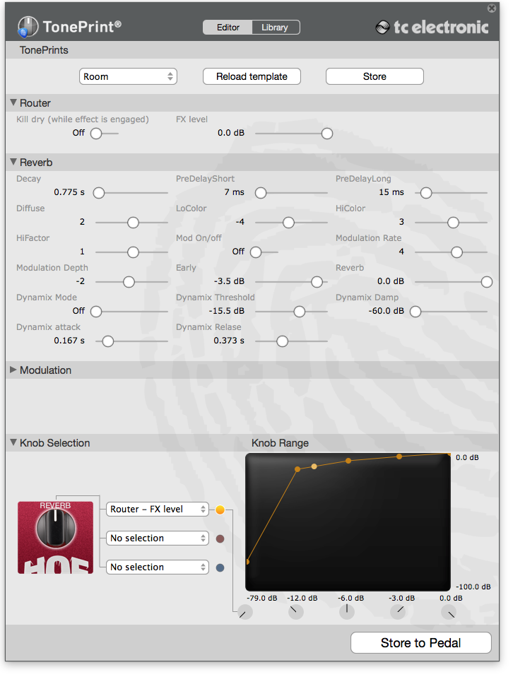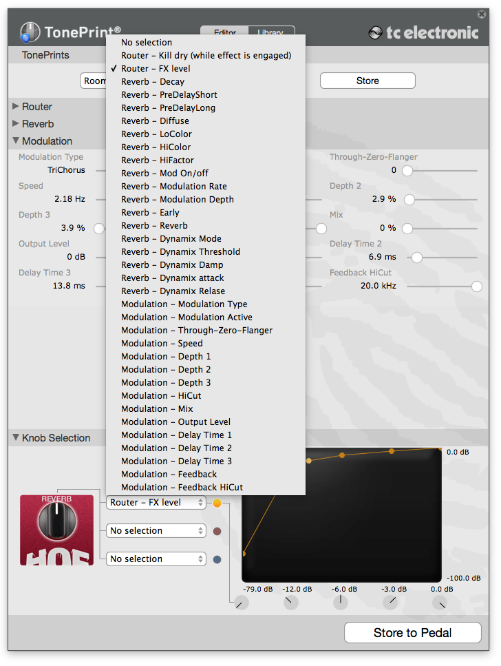 Дальше переходишь к модуляции и кнопкам управления. Самое прикольное при этом, что все производимое тобой моментально в режиме реального времени слышно из педали. Я сидел, воткнув ее в разрыв усилка и одновременно по usb в компьютер, получая результат каждого движения мышкой по ползункам настроек и переключателей на экране. Разумеется, любой наруленный эффект можно было сохранить в педаль и потом пользоваться им без участия компьютера.