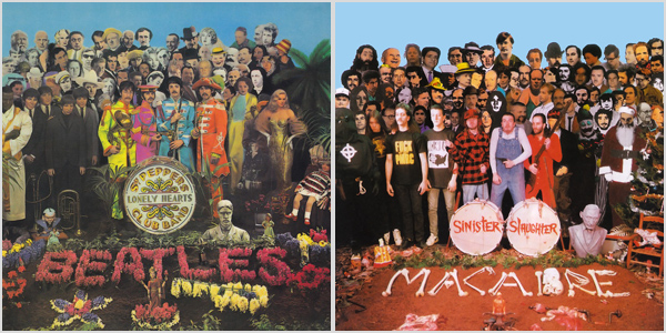 Само собой, мы не будем приводить здесь все известные науки клонированные дизайны - там счет идет на тысячи. Один только альбом "Abbey Road" The Beatles визуально скопирован почти триста раз самыми разнообразными артистами с самым разнообразным умыслом. "А Sgt Pepper's Lonely Hearts Club Band" - более ста. Например, вот так: