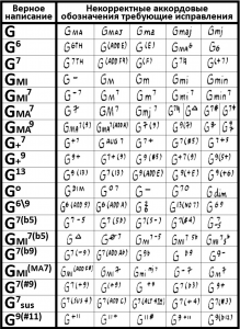 5) MA – это обозначение, которое никогда не встречается само по себе, а только как MA7 или MA9, демонстрируя, что в состав аккорда входит большая септима. Запись типа GMI / GMA, подразумевающая, что минорная терция аккорда меняется на мажорную, не только не корректна, но и сбивают столку большинство исполнителей, заставляя повышать и терцию и септиму. В данном случае верной будет запись типа GMI / G.