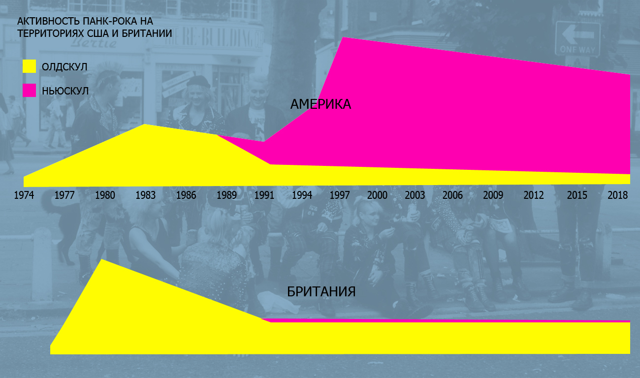 Как и любой музыкальный стиль, панк-рок в своем портфолио имеет периоды рассвета, забвения, перерождения и рутинного бытия. Можно было бы их перечислить словами, но зачем, когда проще изобразить картинкой. На картинке ниже мы указали пики и спады жизнедеятельности панка в двух определяющих странах: США и Британии. Впрочем, будет вежливым и правильным поступком заметить, что панка хватало и в других странах: Австралии, Швеции, Канаде, Японии, даже в России что-то наблюдалось. Но более всего в этом сонме выделяется германская панк-сцена. Ситуацию упрощает то, что биоритмы этой жизни более-менее совпадают со среднемировыми.